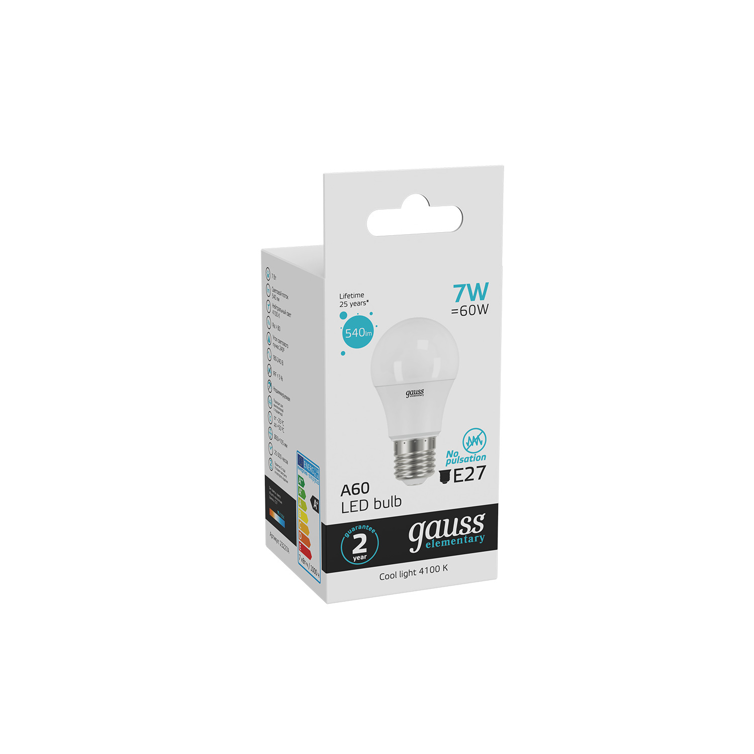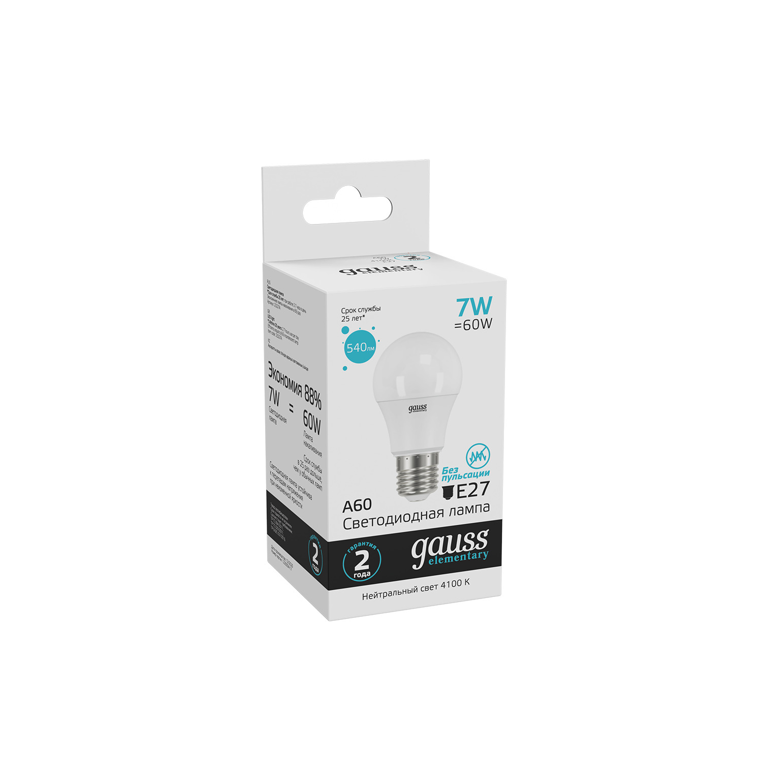 Лампа Gauss Elementary A60 расходует всего 7 ватт электроэнергии для создания светового потока в 540 люмен. Хорошее решение, что бы сэкономить свои и природные ресурсы, не снижая качество освещения небольшого помещения ниже комфортного уровня. Яркость светового потока с температурой 4100К будет достаточной для выполнения различных задач в атмосфере уюта.