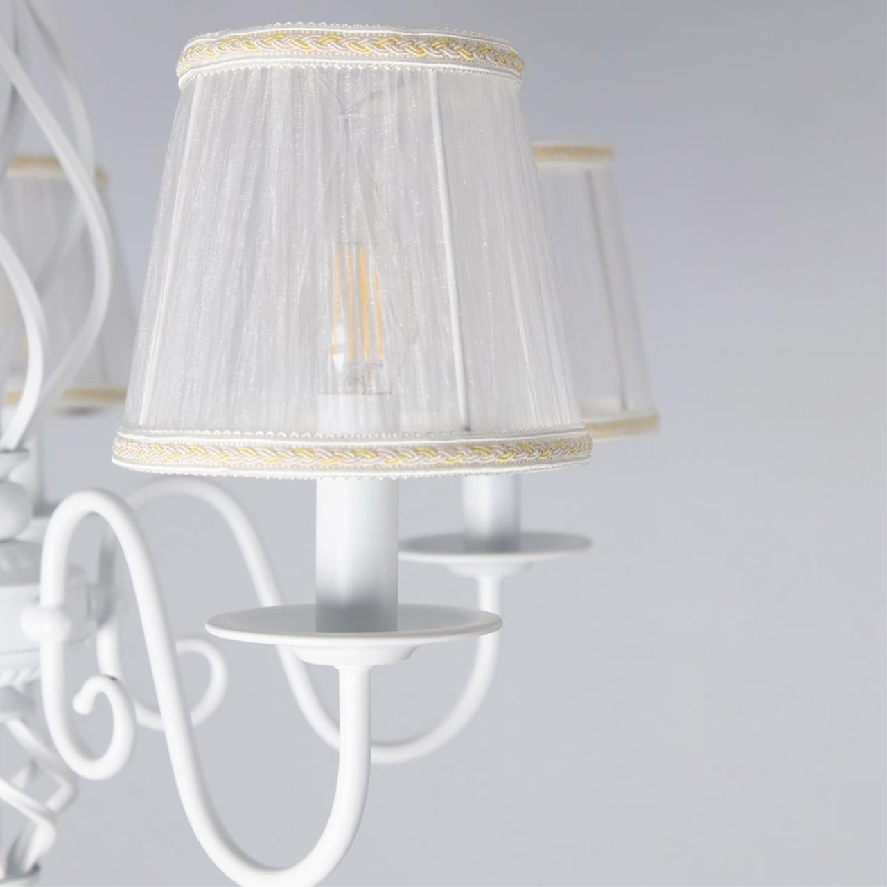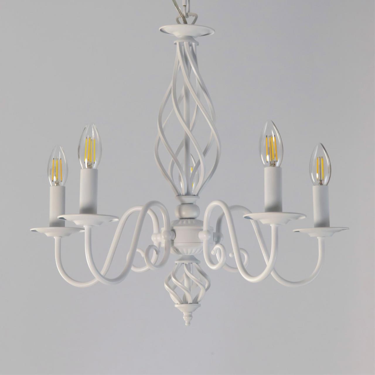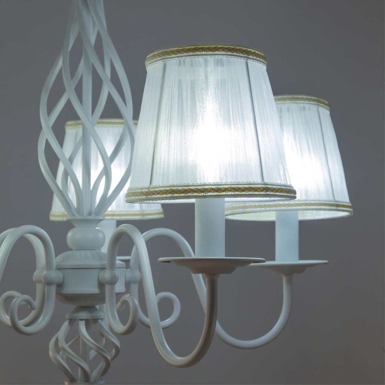 Люстры подвесные коллекции Ровена с завода с возможностью регулировки высоты монтажа. Это позволяет использовать их как в комнатах с высоким потолком, так и в низких помещениях. Минимальная высота с полностью убранной цепочкой составит всего 65 сантиметров, то есть на стандартный не высокий потолок данная модель подойдёт идеально. Серия одна из самых насыщенных с точки зрения модельного ряда. Люстру можно подобрать практически на любую площадь помещения и под любой цвет интерьера, так как модели производятся в двух цветовых решениях. Светильники отлично подойдут практически во все типы комнат, будь то гостиная, спальня или дача. Основание выполнено из прочного металла и окрашено в универсальный белый цвет. Центральная часть люстры украшена оригинальной винтажной фигурой, за счёт которой модель смотрится наполнено, пропорционально. В комплект входит пять белых тканевых абажура, которые сделают свет более мягким и рассеянным. От такого света не будут уставать глаза, также при нем очень уютно. Светлые оттенки светильника очень легко привязать практически к любому интерьеру, а цвет арматуры идеально будет сочетаться с белой мебелью или аналогичными элементами дизайна комнаты. Текстура абажура полупрозрачная, за счёт этого люстры очень яркие – площадь освещения до 16 квадратных метров. Патроны сделаны из качественного термостойкого материала, позволяющего использовать лампочки накаливания до 60 ватт включительно, энергосберегающие или светодиодные лампочки можно применять любой мощности.