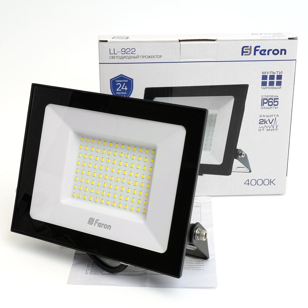 Прожектор светодиодный многоматричный с монтажным креплением на кронштейн, (ДО) FERON LL-922, 100W, 4000К (белый), 230V/50Гц, 10000Lm, IP65, угол рассеивания 120°,*SMD2835, раб.t -40°C - +40°C, цвет чёрный, корпус алюминий литой под давлением + стекло, 216*189*33 мм