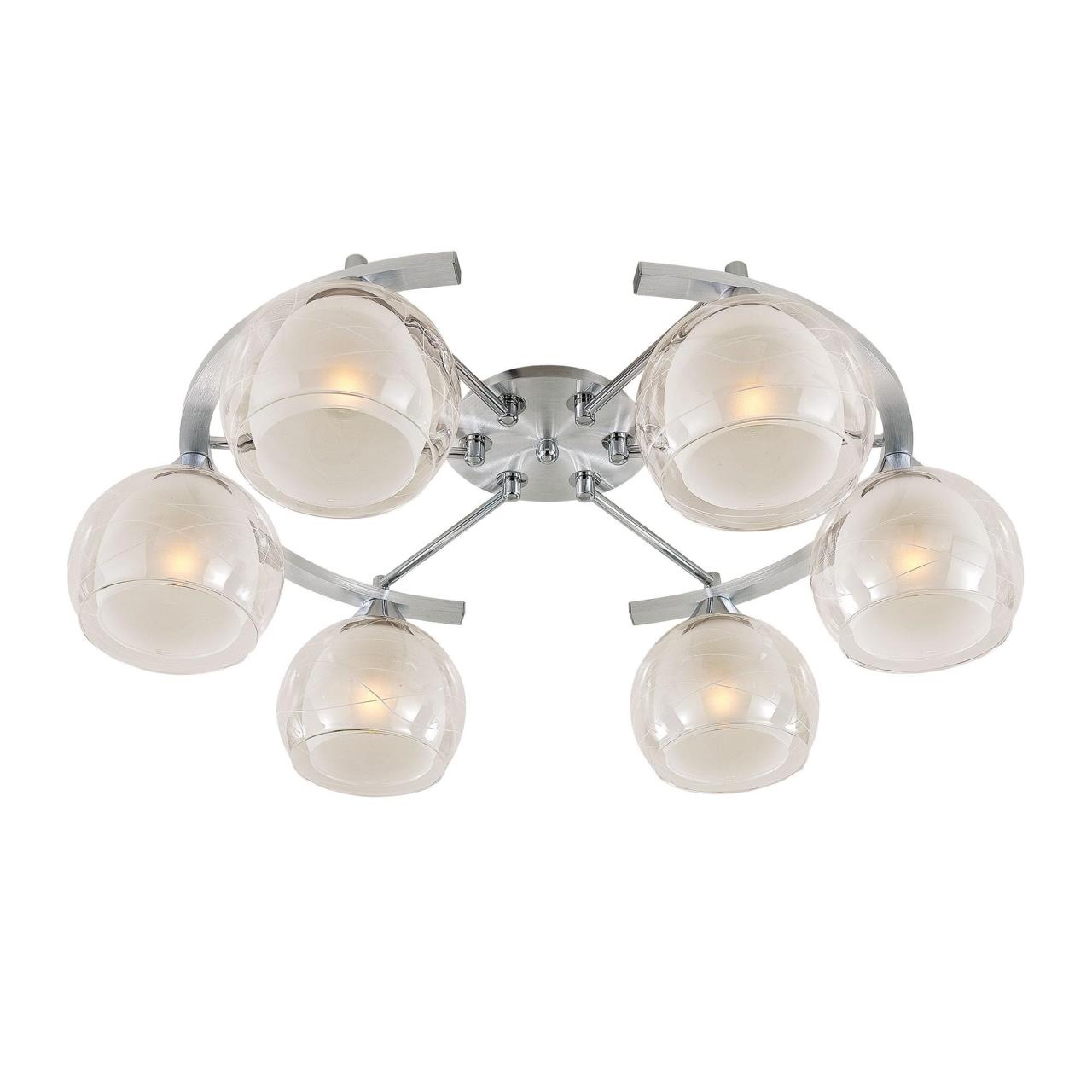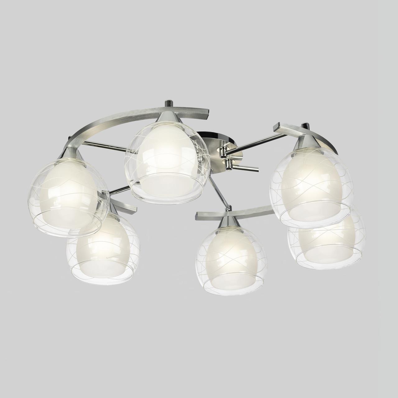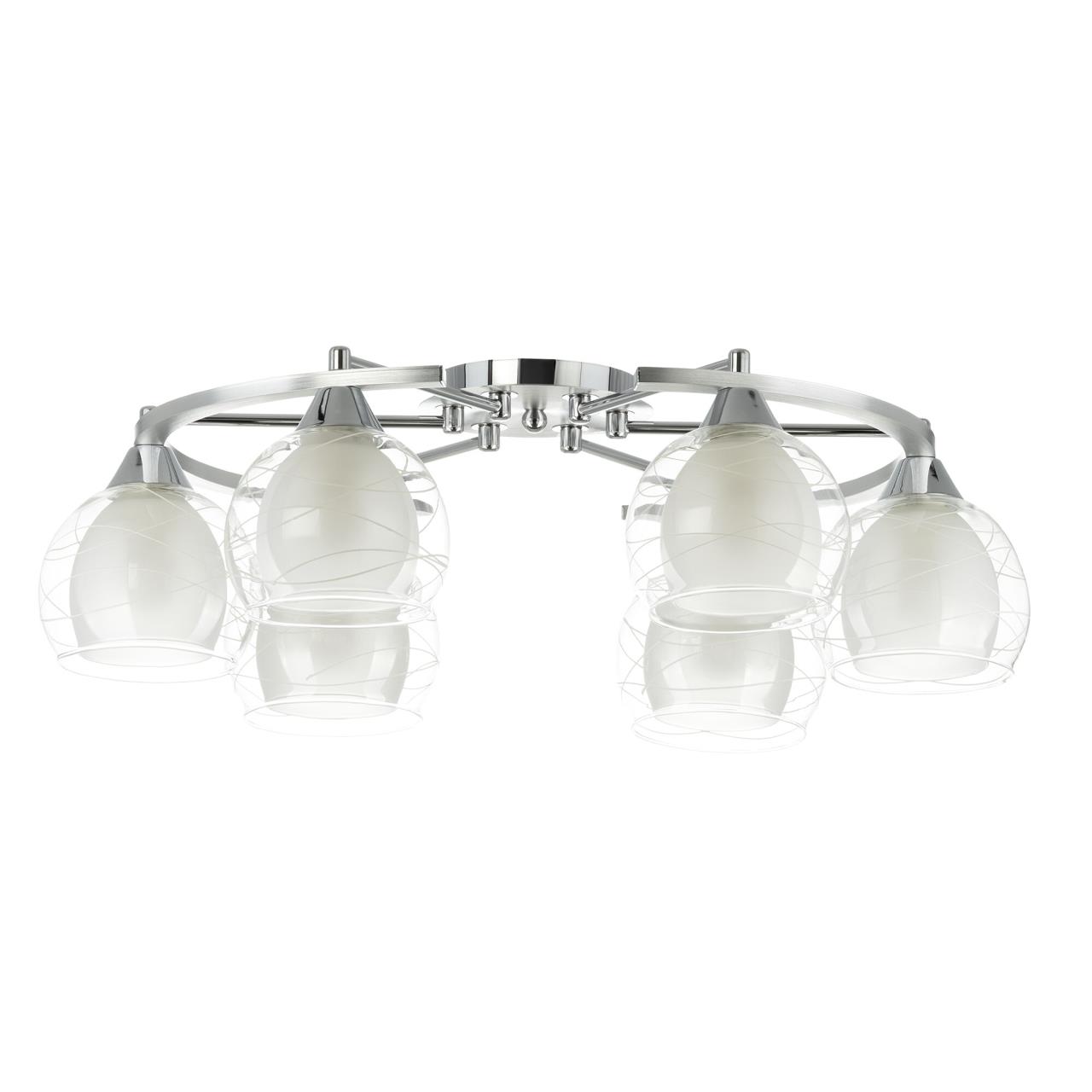 Потолочные светильники серии «Буги» выделяется интересным дизайном в стиле модерн. Люстры сделаны из легкого метала и интересными стеклянными двойными плафонами. Внешняя сторона плафона прозрачная с дизайнерским узором, а внутренняя полупрозрачная. За счёт полупрозрачного плафона свет в помещении получается очень яркий, равномерно рассеянный, но вместе с тем мягкий, приятный для зрения. Арматура модели на шесть рожков с завода в упаковке собрана и скоммутирована на двойной выключатель. Деление осуществлено 4х2, с одной клавиши будет включаться четыре плафона, со второй ещё два. Подключение произведено через один плафон. Люстры производятся в двух цветах: белый плюс хром, идеальное решение для нежных и светлых интерьеров, и алюминий плюс хром, который лучше сочетается с современными дизайнами. Арматура слегка вытянута, не идеальный круг. Такое конструктивное решение позволяет достигать хороших показателей освещённости по углам комнаты. Крепятся люстры под потолком тем самым они не занимают место и прекрасно подходят к помещениям с небольшой высотой потолка. Патроны выполнены из термостойких материалов, выдерживают лампы накаливания до 75 ватт включительно, а энергосберегающие, или светодиодные лампы можно использовать любой яркости, что позволит вам осветить большие площади. Площадь освещения моделей на четыре рожка до 21 квадратного метра.