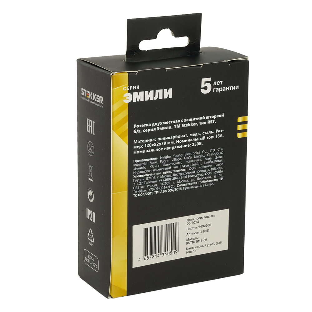 Розетка STEKKER RST16-5116-05 на 2 гнездо, -, без заземления. Материал: поликарбонат, бронза, сталь, цвет черный уголь, soft touch, размер 120*82*40мм. Номинальное напряжение 250, номинальный ток 16А, диапазон рабочих температур 0..+35°C, 20