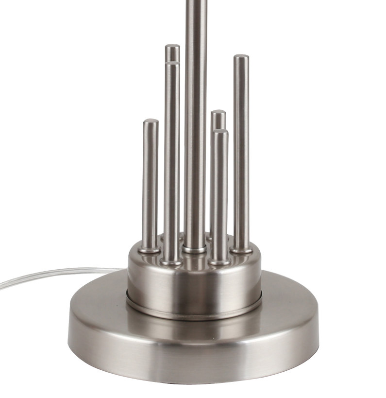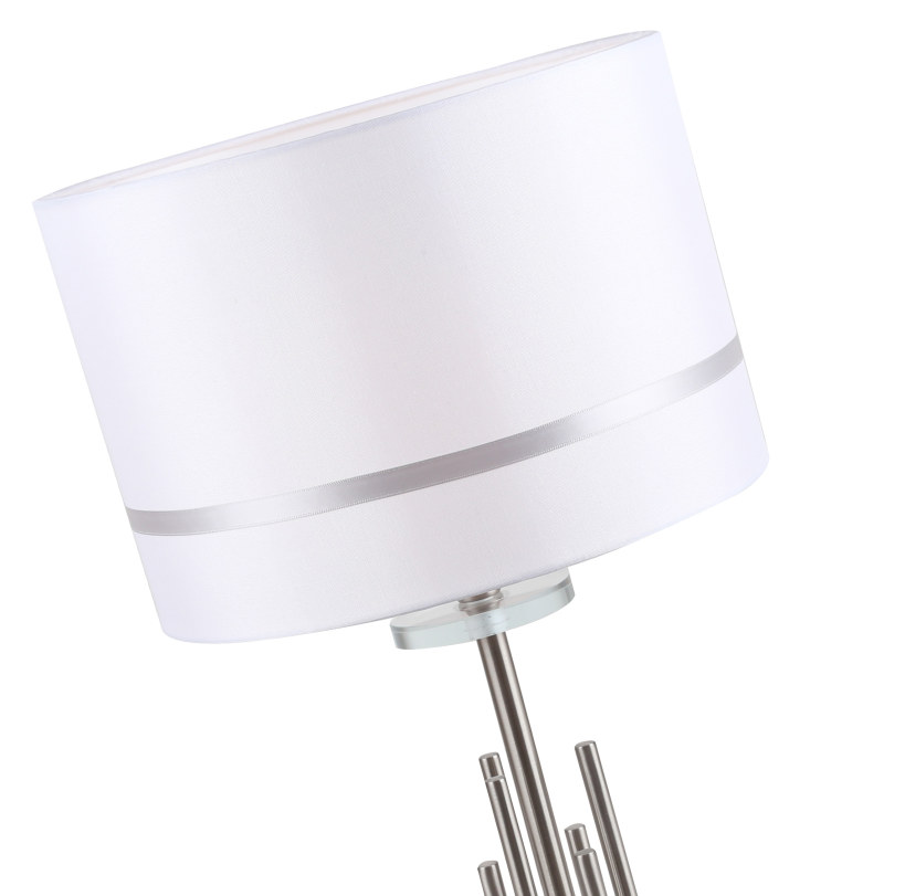 Светильник настольный из коллекции Chart / Чарт выполнен из металла, гальванизированного в цвет никеля, и декорирована железными стержнями в цвет арматуры. Текстильный абажур белого цвета с термостойким акрилом внутри отделан кантом в цвет арматуры. Декоративная розетка выполнена из прозрачного стекла.