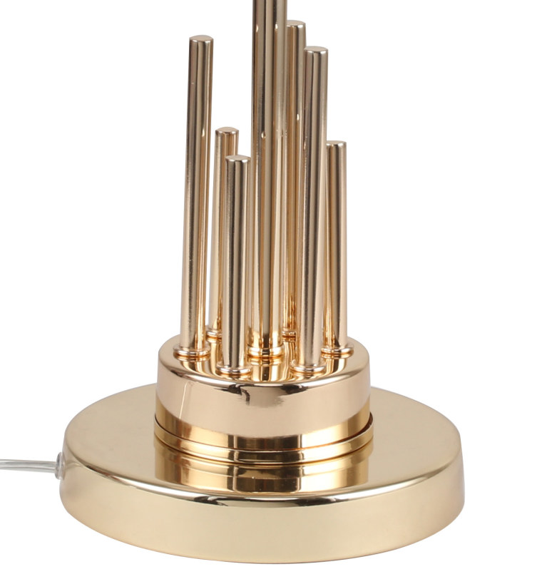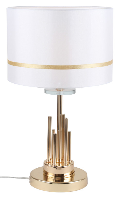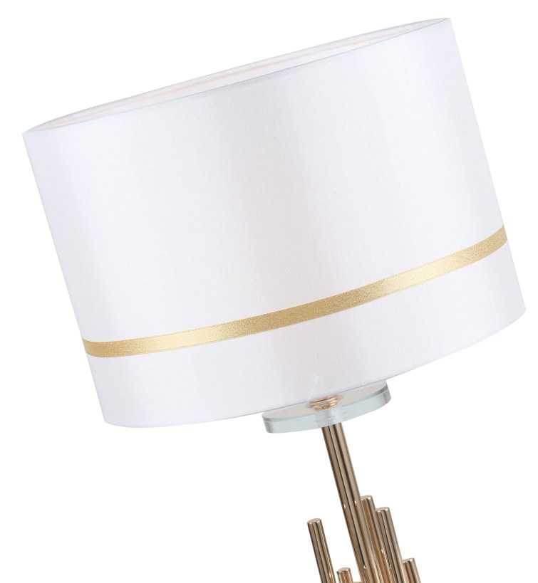 Светильник настольный из коллекции Chart / Чарт выполнен из металла, гальванизированного в цвет золота, и декорирована железными стержнями в цвет арматуры. Текстильный абажур белого цвета с термостойким акрилом внутри отделан кантом в цвет арматуры. Декоративная розетка выполнена из прозрачного стекла.