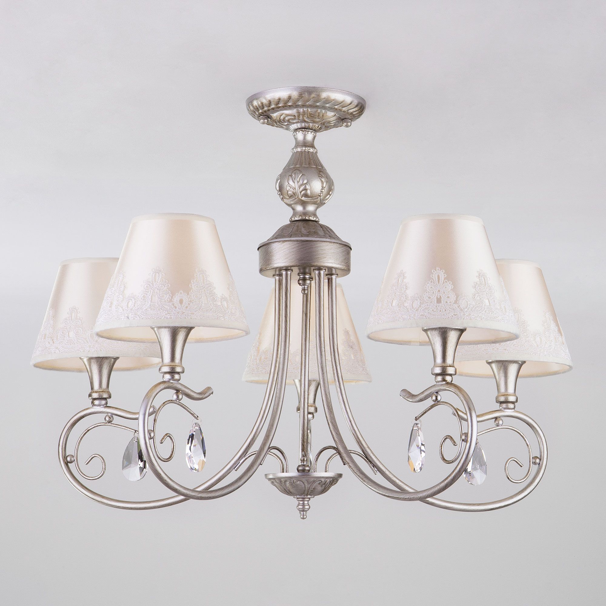 Утонченная серия светильников «Incanto» станет настоящим украшением как классических, так и современных интерьеров. Нежные атласные абажуры, декорированные белоснежным кружевом, идеально дополняют фигурное основание в сдержанном цвете состаренного серебра, а хрустальные подвески завершают композицию.