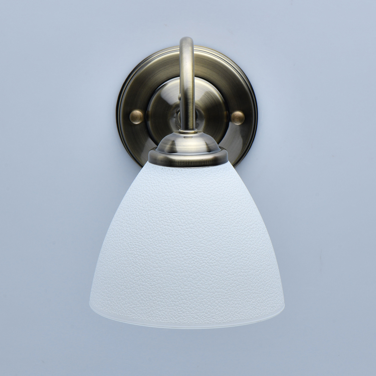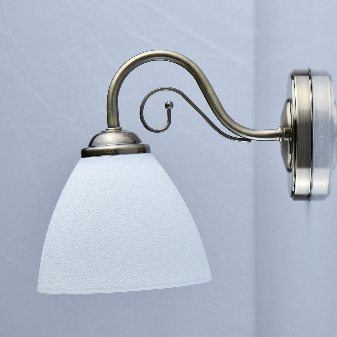Основание светильника выполнено из металла и гальванизировано в цвет античной бронзы. Светильник декорирован стеклянным плафоном белого цвета.
