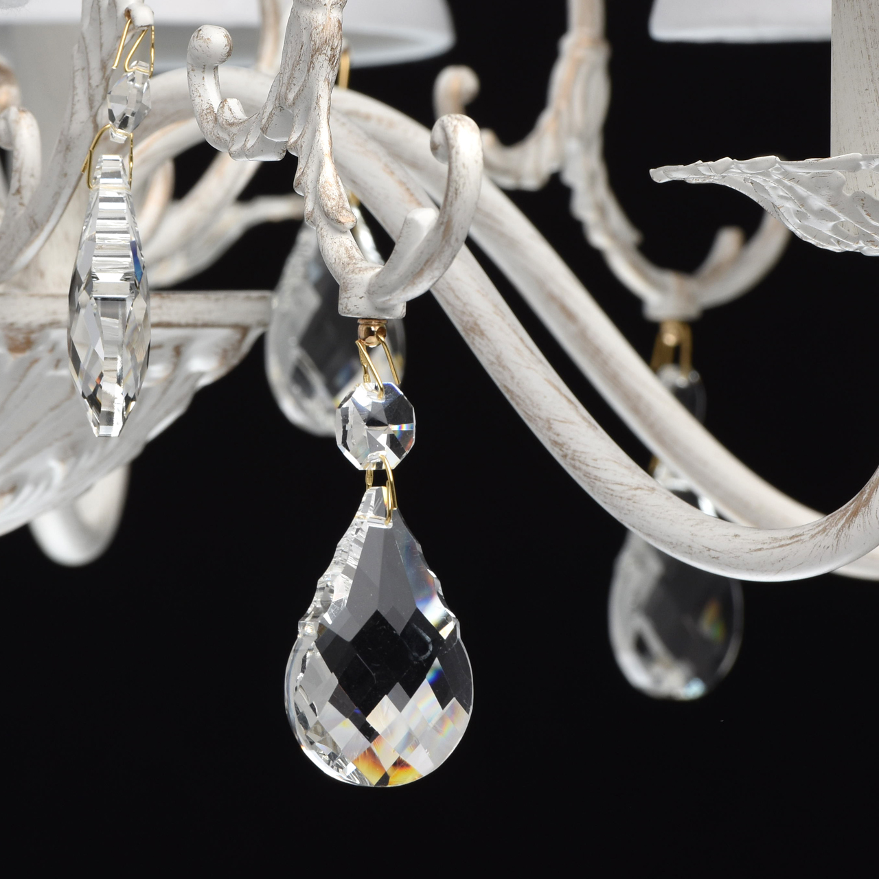 Элегантная и нежная люстра из коллекции «Виталина» придется по душе даже самым искушенным эстетам. В ней всё гармонично: металлическое основание матового белого цвета дополнено эффектом патины в цвет золота, плавно изогнутые рожки и ажурные розетки подчеркнуты лёгкими тканевыми абажурами белого цвета с сатиновой фактурой. Ещё более эффектной делают люстру декоративные хрустальные подвесы, которые создают мягкие переливы.